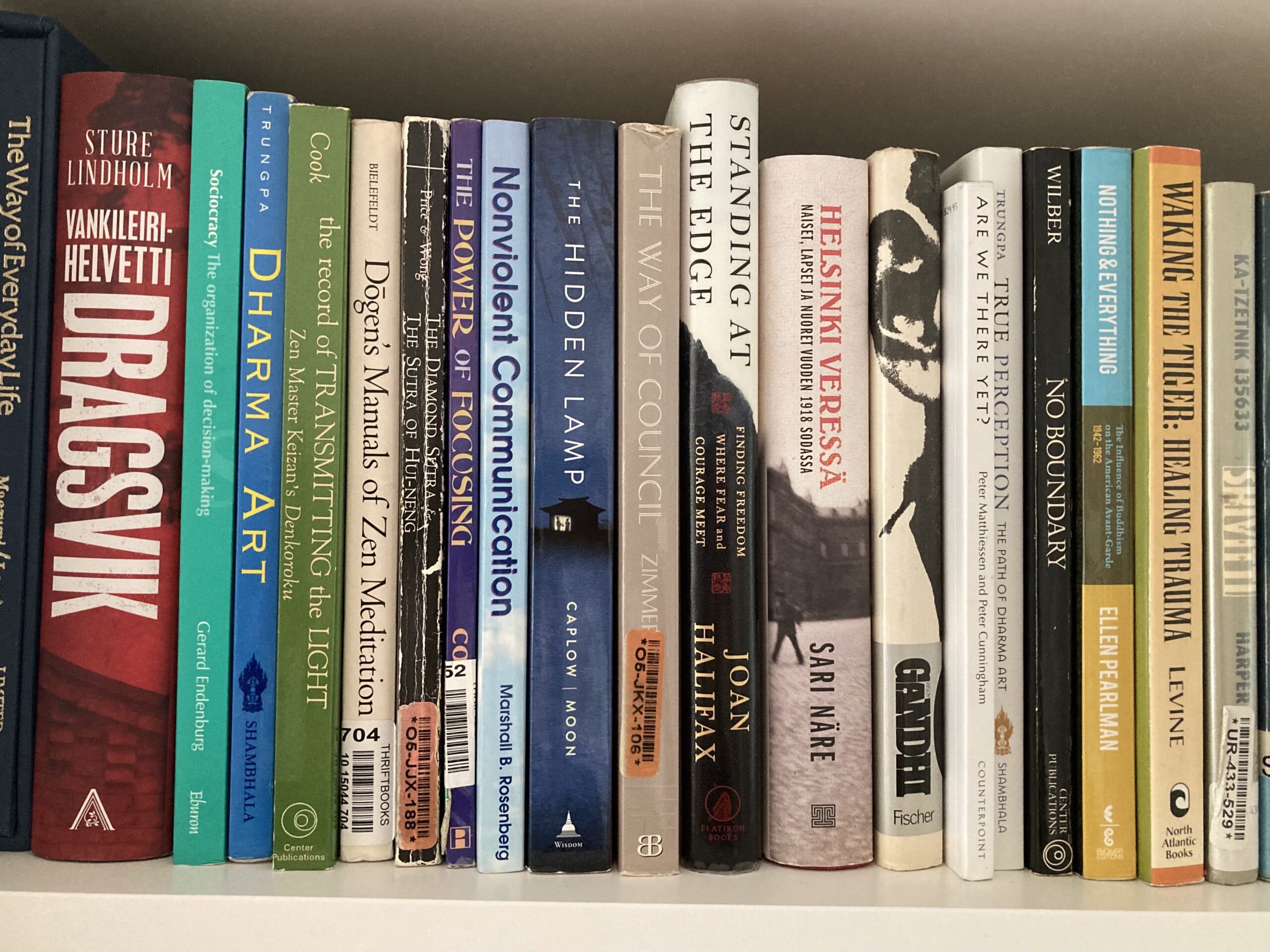 Helsinki Zenillä on laaja ja jatkuvasti kasvava kirjasto, joka kattaa harjoituksemme eri osa-alueita. Kokoelman tarkoituksena on innostaa ja palvella uusia rauhantekijöitä. Osa kirjoita on saatu lahjoituksina eri puolilta maailmaa. Suurin yksittäinen lahjoittaja on White Plum Asanga -perimyslinjan kotitemppeli Zen Center of Los Angeles (Great Dragon Mountain – Buddha Essence Temple).